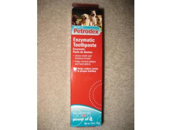 Petrodex brand name dog toothpaste. 2.5 ounces. The hydrogen peroxide-producing formula helps reduce plaque and tartar accumulation. Does NOT foam - no need to rinse.
