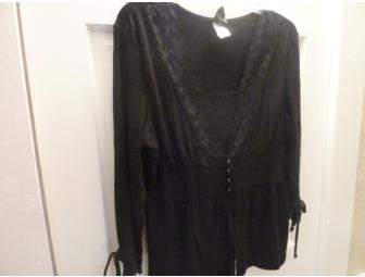 Beautiful long-sleeved black shirt/blouse by J.T.B. Black lace trim lines the neckline and leads to four round black buttons. The cuffs of each sleeve feature more lace trim, plus an adorable string/tie.