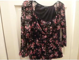 Beautiful knit top by New Directions. Features a rose pattern in pinks & white. Latches down the front, with some ruching. Sleeves are a a see-through lace type material.