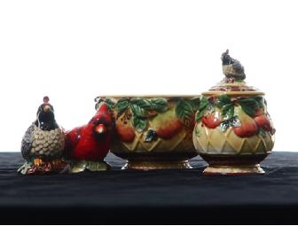 Add a touch of aviary style to your dining space with this ceramic decorative bowl, sugar container with quail on top lid, and cardinal & quail salt/pepper shakers.