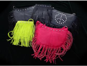 You’ll have loads of fun deciding which bag to use with this Purse Party Package. Included are 2 small sleek leather shoulder bags with decorative fringe in black and chartreuse, and 3 small half moon size purses with decorative fringe in black and fuschia – one even has a peace sign in rhinestones!