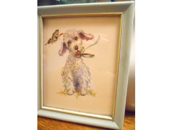 This charming vintage (1950-60's?) bichon print is just too cute! A small, white fluffy pup, sitting pretty with a lovely turquoise bow around it's neck and a butterfly floating by. I freshened up the original frame with "duck egg" paint - the same turquoise shade as the puppy's bow! It is marked "Donald Art Co. NY", size 5 inch x 6 inch. (White background, not yellow as one photo depicts.)