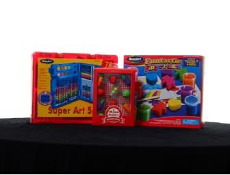 The Super Art Set has 78 pieces! The set includes markers, colored pencils, crayons, watercolors, oil pastels, paintbrush and a sharpener all in a portable storage case!
