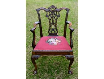 This impressive Chippendale-style armchair is hewn from lustrous, robust mahogany and features stunning details such as a ribbon carved back, acanthus carved knees, and ball-and-claw feet. Circa 1890.