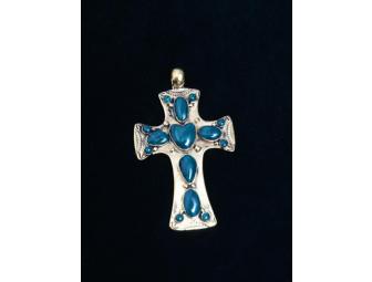 This beautiful cross pendant for a necklace is Brass and Malachite, and measures 2.5”x2”.