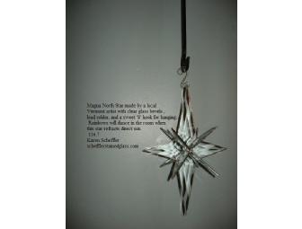 The Magna North Star - made by a local Vermont Artist with clear glass bevels, lead solder, and S hook for hanging. Rainbows will dance in the room when the star refracts direct sun. Measures 11" x 7".