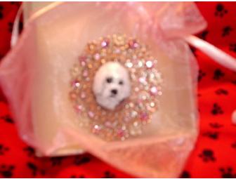 THE BROOCH MEASURES 2"x2" WITH THE BICHON PAINTING MEASURING 1" WITH PIN CLOSURE ON BACK. THE BICHON FACE IS HAND PAINTED ON A PALE. PINK 1" CENTER STONE BY PAULA HOLOMAN, EBAY SELLER PUPSPAWZ, EMAIL ADDRESS, Fxtc@aol.com THE BROOCH IS IN A CUTE LITTLE PINK DRAWSTRING POUCH.