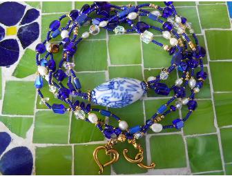 The focal bead of this 3 strand necklace is an unusual Chinese porcelain bead with a hand painted dragon! Three braided strands contain lots of cobalt blue Czech glass in many shapes - stars, hearts, leaves, bow ties, rounds, flat squares, cubes and bicone. Counter point to the deep cobalt (navy) blue are many Swarovski crystal beads including cubes, flowers, rounds and bicones. Bright white fresh water pearls relate to the white of the Chinese porcelain. The gold tone toggle clasp is a small heart. The tiny cobalt blue Charlotte beads are actually vintage from the 1930's. The gold Charlotte beads are modern 14k gold Japanese beads.