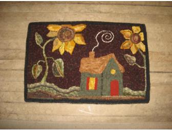 Hooked Rug..."Sunflower Cottage" is a small hooked piece for the table, the wall (by hand-sewing a hanging sleeve on the back) or on the floor. It was designed and hand- hooked by Sunnie Andress of Old Crow Farm. 100% wool strips on linen backing. Spot clean.
