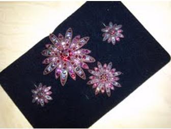 Two flower pins and matching earrings with shades of red crystals.