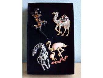 Set of 4 animal pins: lizard, camel, flamingo, and giraffe.