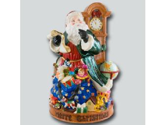 As the midnight hour draws closer, Santa checks his list to make sure he's prepared to deliver all the gifts to the allotted recipients. Behind him is an oak grandfather clock with a red gift ribbon. A golden-star covered blue bag spills its contents around his feet. There is a doll, train engine, drum, and other toys.