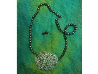 This sterling silver necklace features a delicate fan coral pendant accented by the St. John's famous petroglyph hung on a string of black fresh water pearls. Included is a pair of black water pearl earrings. Comes with presentation case. The piece is called "Sea Dreams".