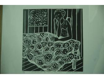 Original linocut by St. John artist, Janet Cook-Rutnik. Print number 3 from a series of 8. Inspired by the short story "No One Writes the Colonel Anymore" by Gabriel Garcia Marquez. Print size 9" x 8.5" on 14.5" x 14" paper.