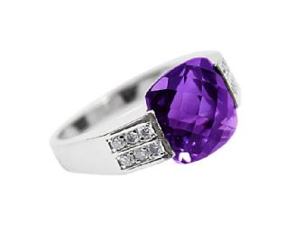 Ring Specs: This fabulous ring is 18k white gold with a 4ct. cushion cut amethyst with a checkerboard top flanked by 12 diamonds H in color and SI2 in charity, weighing a total 0.25ct. This ring is a size 5.5.