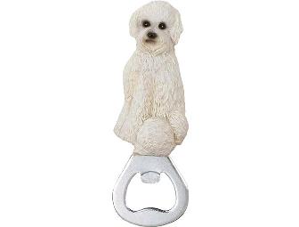 Bichon Frise Magnetic Bottle Opener: Pop open a cold one with a little help from Man's Best Friend! The sculpted resin Bichon Frise features a magnetic backer so you can leave it on the refrigerator when not in use. Bottle opener measures approximately 4.5" high.