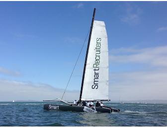 X40 SmartRecruiters is an Extreme 40, a full carbon machine, one of the fastest sailboats on San Francisco Bay, dedicated to promoting high speed catamarans in the SF Bay Area. The Extreme 40 was created with two things in mind: action and adrenaline! The boat is produced in an autoclave from carbon fiber and Nomex core. This technology is normally reserved for aircraft construction or F1 car racing. The boat is estimated to reach speeds of 35 knots on flat water in around 20-25 knots wind. She will also fly a hull in as little as 8 knots. Experience the thrill with four guest crew positions on a mutually agreed upon date.