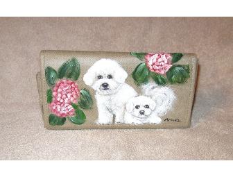 Artist Manuela Quick has painted two gorgeous Bichons and pink flowers with leaves.