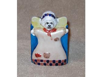 This is a ceramic piece in a lovely shade of blue. Artist Manuela Quick has hand painted a Bichon on the face of the angel.