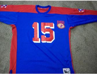 Replica 1947 Throwback Game Jersey of #15 LOS ANGELES DONS from the All-America Football Conference:1946 to 1949. Red and Blue long sleeve heavy fabric jersey with red numbers--Mitchell and Ness Brand--All Numbers and Letters are sewn on--100% Polyester--Made in Korea--Gently Used in Excellent Condition overall. Mens Size XXL (54).