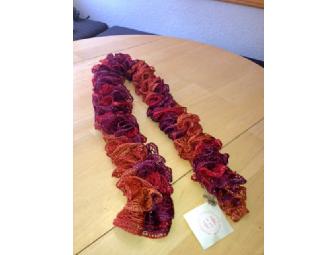 This lovely hand-crocheted scarf, in vibrant fall colors, is made of orange, red and maroon silk thread - with a delicate strand of gold running through it. So light and airy, it feels like a feather boa!