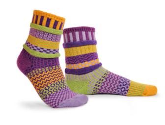 A cozy, colorful pair of socks in crocus style, size medium fits women shoe sizes 8-10 or men shoe sizes 7-9.  Colors in this sock: purple, lilac, dark purple, lime green, yellow.  If you enjoy seeing the crocus blooming in the spring, you're sure to enjoy the colors in this fun and wonderful sock.