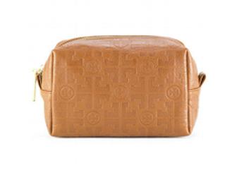 Brigitte by Tori Burch, embossed leather cosmetic case in brown Pretty and practical 5"H b 7"W x3"D with zip top. $125 value.
