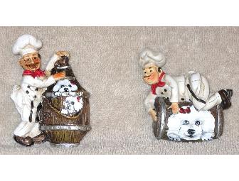 One has a chef standing at a wooden barrel with two Bichon puppies hand painted. Size is 3" tall and 2" wide.