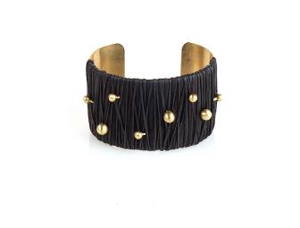 This stunning brass cuff is wrapped in torn-edge black fabric, black waxed linen and adorned with multi-sized brass spheres. (1.5” wide)