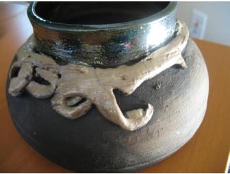 The process of Raku is accomplished by using very sandy clay and a low-fired kiln. The pieces are removed from the kiln at a peak temperature of 1800 degrees with a tong and placed in a closed container with some combustible to smolder. The carbon that is released combines with the glaze to form the lusters.