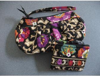 Signature Vera Bradley convertible bag with coin purse. Shoulder strap adjusts from a 12" drop to a 24" drop. Hard base to hold its shape. Soft pleated fabric body with zipper closure. Matching coin purse. 100% cotton shell & lining. Washable.