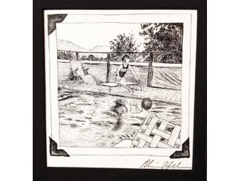 This item is the signed original art for the Chapter 7 title page of Alison Bechdel's book FUN HOME, donated by series creator Alison Bechdel. It is india ink on bristol board. The frame is black wood, 1 inch wide, 1 1/8 inches deep.