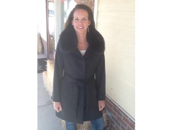 Charcoal colored 100% cashmere coat with dyed fox collar