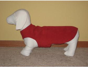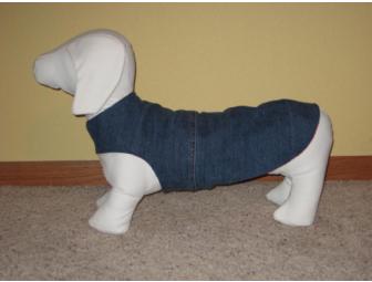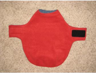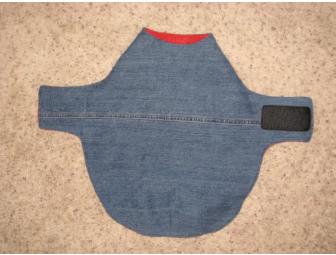 This is a Tweenie size coat that measures 16 1/4" from collar to rump. It is adjustable around the middle by several inches to fit the average size Tweenie. It is made of re-purposed denim on one side, and red fleece on the other. Warm, comfortable, durable, reversible and affordable Dachshund coat, designed to fit (and cover) the unique shape of a Dachshund. Quality made, with comfort and convenience in mind.  This coat slips on over the head and adjusts under the tummy with approximately 3 1/2 inches of commercial grade velcro that is stitched twice all around for extra strength. Fits male or female. It is fitted at the rump with 3 darts on both layers to fit snugly and has no sleeves which tend to irritate under little arms during walks.