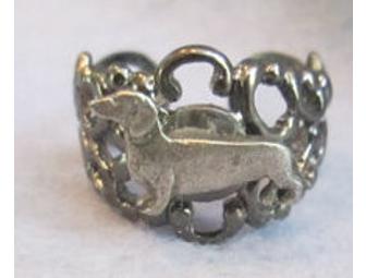 This sweet ring is one size fits all. The ring is silver gun metal grey. The Doxie is solid detailed pewter. This is a limited edition.The ring is substantial filigree. The ring comes in a gift bag with a signed tag.