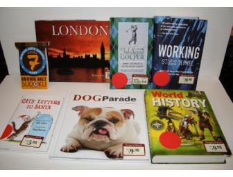 This item is a selection of books donated by Barnes & Noble of Burlington, VT. Included: Brown Belt Sudoku,The Intelligent Golfer, Cats' Letters to Santa, Working, World History, Dog Parade and London. This item is a GREAT value!