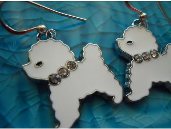 These unique Bichon earrings are delightful and fun - the perfect charm for earrings! About an inch in length and height, and not to heavy for comfortable wearing. The back plate is shiny silver metal and the little bichon is wearing a collar of three rhinestones. They are just too cute!