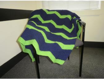 This beautifully crocheted Navy Blue and Bright Spring Green Afghan measures approximately 55x45 inches. Hand made and donated by Heather Kile