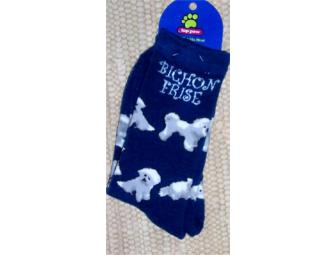 Navy blue, high socks with all-over print of Bichons. Blend of acrylic/polyester/spandex. Machine washable. Brand new. Size medium, womens 6-11.