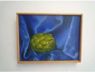 Composed by realist painter George A. Rada, who produced a portrait of James Beard that now hangs in the James Beard House, this food “portrait” depicts an artichoke surrounded by rich blue satin. The painting measures 9 by 12 inches, and is framed in a wooden gallery frame.