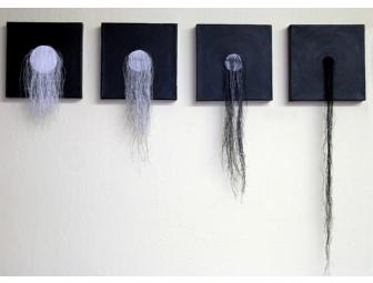 Mixed: Canvas, acrylic and thread. Tetraptych (4 pieces), each 8"x8": total size 35"x33" Please note: the width of the piece varies depending on spacing.