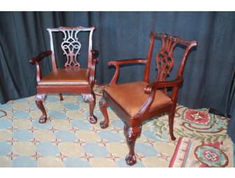Read a book by the window in your new Chippendale-style mahogany armchairs with interlaced carved backs, carved cabriole legs with ball and claw feet. They are manufactured by Baker Furniture Company.
