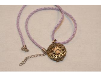 This beautiful filigree style locket has a beautiful paw print on the front, and opens up to stash a photo of your beloved pet. Locket measures 1 1/8" in diameter. The cord is purple braided polyvinyl that extends from 17-19 inches long and closes with a lobster claw clasp.