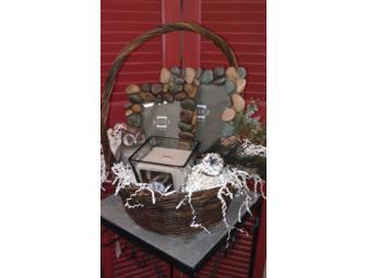Capture your favorite outdoor memories, and remember them forever with this lovely gift basket from Walker St. Pharmacy and Gifts. This gift includes two river rock frames (5x7 and 4x6), a crackling wick candle, and an owl figurine...all presented in a willow basket with a greenery pick.