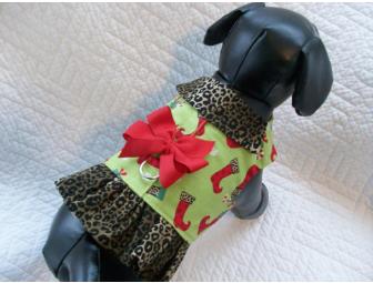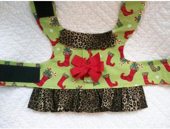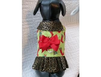 This beautiful vest with an adorable Christmas print is also a harness. It velcros at the neck and around the girth. This one has a short ruffle on it in a leopard print. This item will be custom made to fit your dog and shipped directly from the artist. Make your holiday pictures special this year with this adorable outfit / harness!