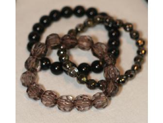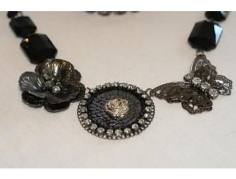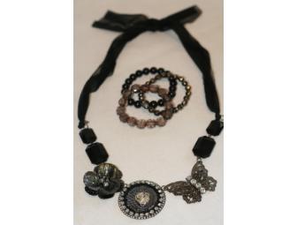 This beautiful necklace features three pendants - a flower, a butterfly, and a circle with a rose in the middle. Necklace is on a black ribbon with a few large cabochon rhinestones. Also includes three beautiful beaded bracelets that coordinate beautifully with this piece.