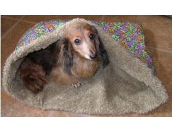 Dachshunds are natural burrowers - - and what better to burrow in than a shearling-lined sleeping bag? The interior is lined with soft, imitation sheepskin. The exterior is covered with durable cotton fabric with a multicolored pattern (the photo with the dog is not the pattern you will receive). Beds are washable and dryable.