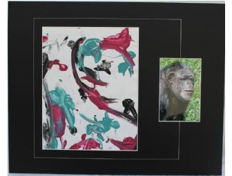 Bo, African Chimpanzee, is a big girl with big artistic talent! Her artistic flair stands out as one of Knoxville Zoo's finest. Bo perfectly utilizes red, teal and black tempera paint to go on a textured paper background. Fast Frames has donated the professionally cut black matte with a white bevel and accent line. Dimensions: 20" x 16".