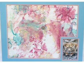 Elsa, African Lion, dreams up a playful hodgepodge of happy colors. The pink, light blue, and yellow tempera paint combine in a pleasant swirl of color on a white paper background. Fast Frames has donated the professionally cut light blue and dusty pink double matte with white bevel. Dimensions: 26 1/2" x 21 1/2".