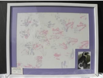 Sylvester and Ruby have danced their way into our hearts by creating this charming Limited Edition painting using pink and lilac tempera paint on a white paper background. Fast Frames has donated the professionally cut light purple matte with a white bevel. Fast Frames also donated the white wood frame that completes this sweet artwork. Dimensions: 26 3/4" x 21 7/8".